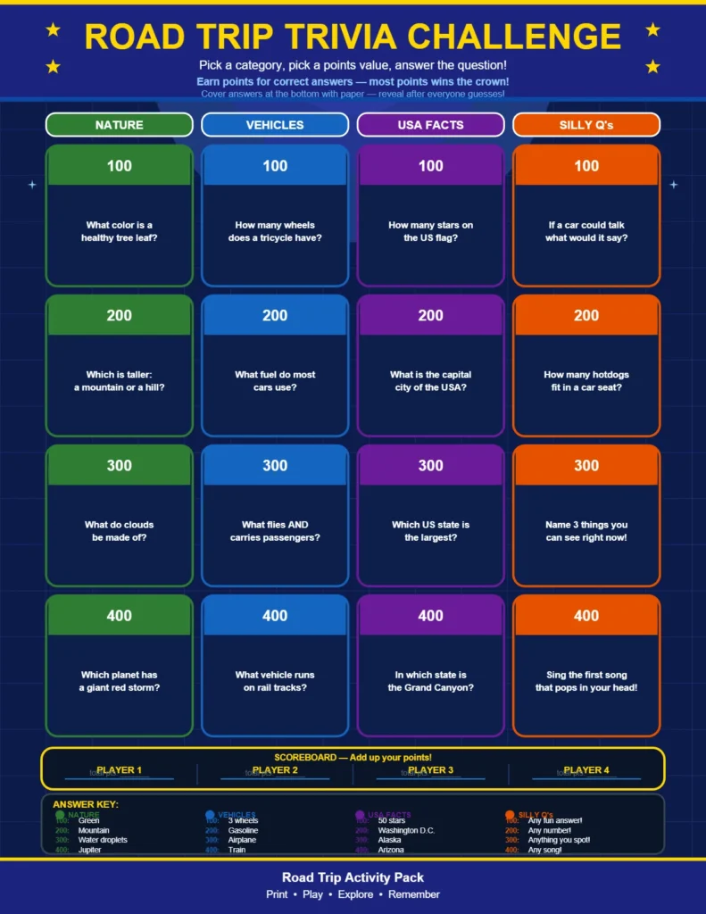 This is the go-to for families with older kids or when the drive starts feeling very long. The Silly Q’s category (“How many hotdogs fit in a car seat?”) keep things from getting too serious. A genuinely great printable road trip game for kids that adults secretly enjoy just as much.